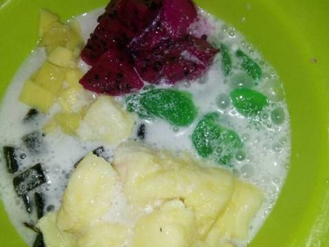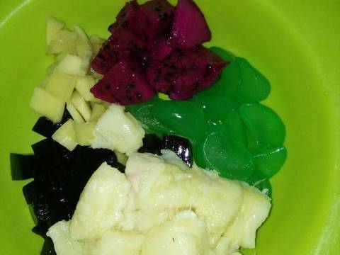 Siapkan semua bahan, potong2 dadu. Rebus kolang kaling dg air, gula & pewarna makanan (bukan dr bahan syrup) tiriskan. -